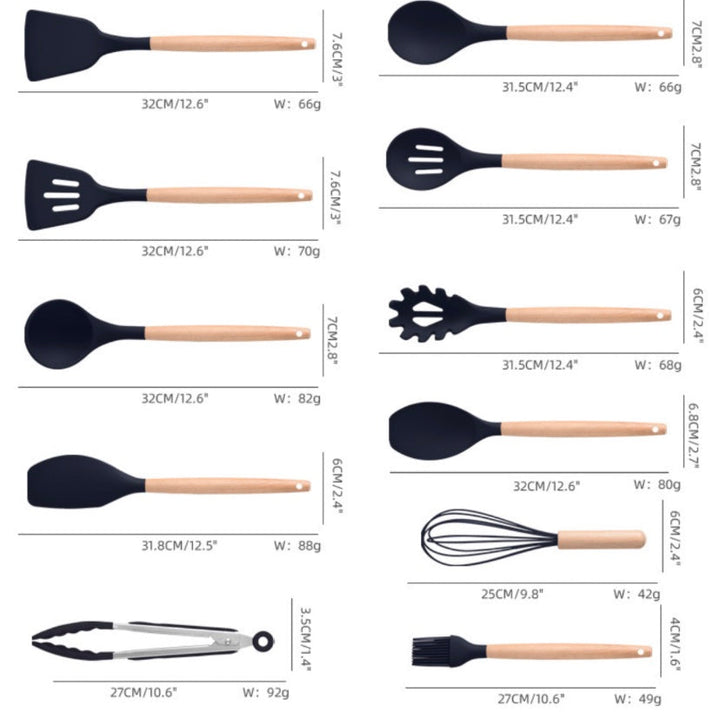 Setul este confectionat din silicon de inalta calitate, rezistent la o temperatura de maxim 446 ° F / 230 ° C. Ustensilele de bucatarie sunt, de asemenea, antiaderente si non-toxice, sunt usor de utilizat si de depozitat. Utensile au un maner din lemn extrem de ergonomic ce nu transfera caldura (pentru a va proteja mainile) si care este antibacterian.