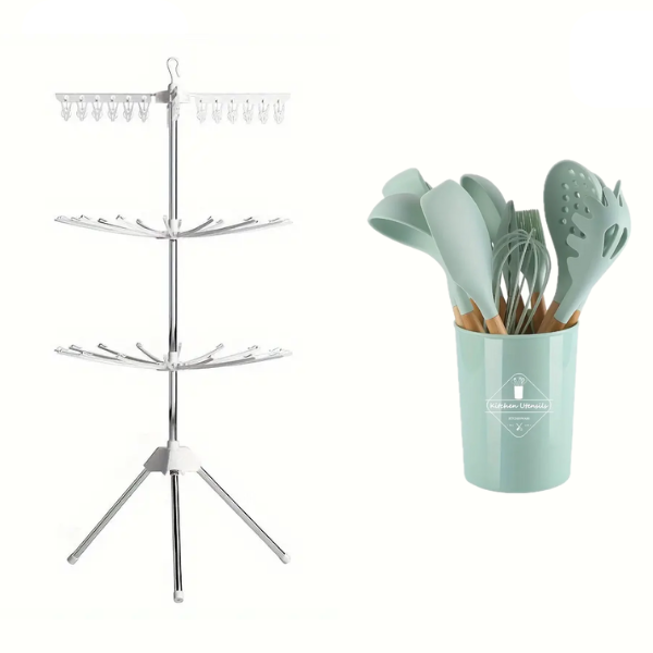 Uscator vertical pentru rufe + Set 12 Ustensile de Gatit din Silicon, cu Maner din Bambus